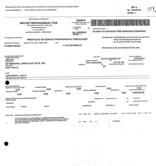 JBS ao PSB, R$ 11.100.000,00 teriam sido para a Nacional, R$ 2.950.000,00 para