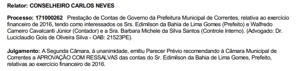 Correntes a aprovação com ressalvas das contas da Gestão Edimilson da Bahia,