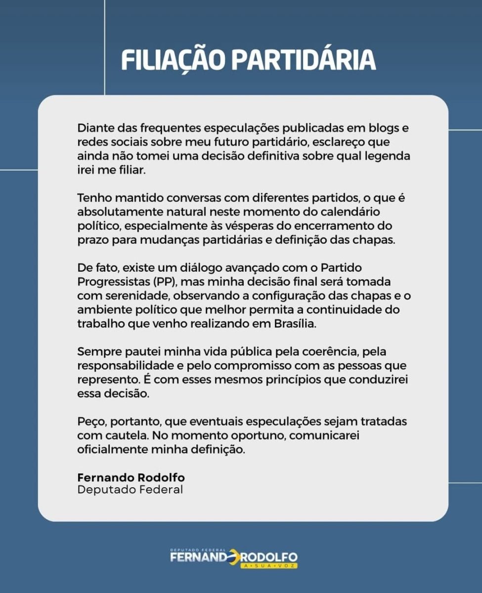 Fernando Rodolfo confirmou que mantém diálogo avançado com o Partido Progressistas (PP), mas ressaltou que a decisão final será tomada com cautela. De acordo com o Deputado, a escolha levará em consideração a configuração das chapas e o ambiente político mais favorável à continuidade do trabalho que vem desenvolvendo em Brasília.