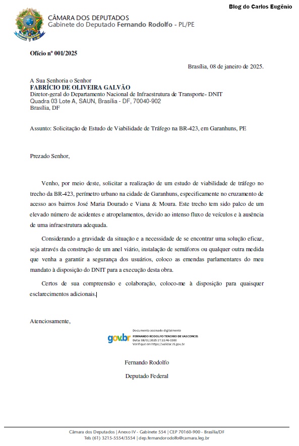 Para solucionar problemas e garantir a segurança de condutores de veículos e de pedestres que trafegam pelas rodovias que cortam a área urbana de Garanhuns, o deputado Federal Fernando Rodolfo (PL) esteve nessa terça-feira, dia 4, na sede do Departamento Nacional de Infraestrutura de Transporte (DNIT), em Brasília, para tratar de assuntos relacionados a construção da passarela na entrada da comunidade de Manoel Chéu, na BR-424; e o acesso aos bairros da Brahma e Viana & Moura, via BR-423.