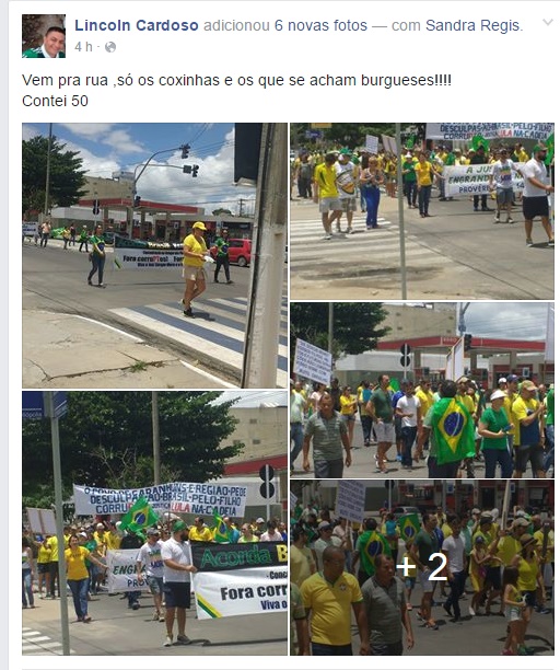CONTESTAÇÃO – Mas apesar do número de participantes apontados pela PM, nas redes sociais, sobretudo no facebook, apoiadores de Lula e Dilma, questionaram a informação. “Eu contei 50 pessoas. Só Coxinhas e os que se acham burgueses”, escreveu o professor Lincoln Cardoso em seu perfil.