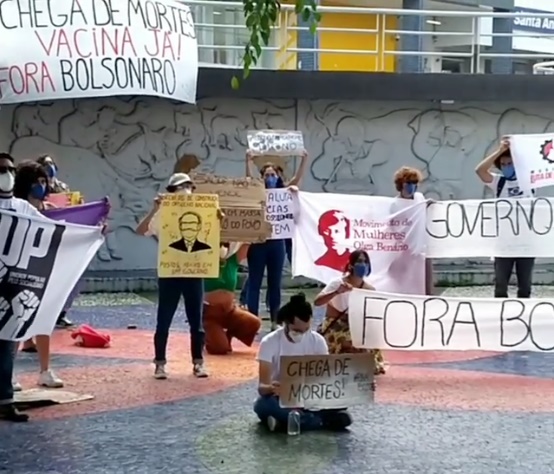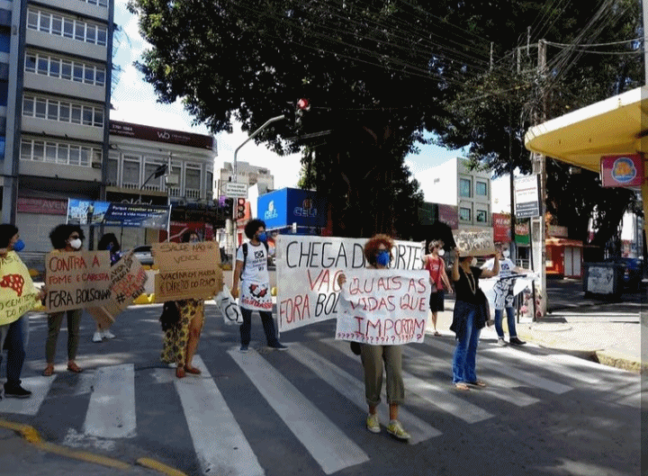 Vírus”, cantaram e gritaram palavras de ordem, no espaço Luiz Jardim e nos semáforos localizados defronte a agência da Caixa e a Iza Calçados. Também foram promovidas lives e colagem de lambe-lambes em diversos pontos da Cidade.