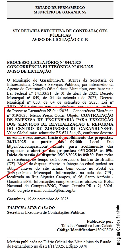 O Centro de Zoonoses de Garanhuns (Centro de Controle Ambiental) vai passar por reformas em breve. A Prefeitura publicou nesta sexta-feira, dia 21, no Diário Oficial dos Municípios, o aviso de abertura do processo licitatório para contratação de uma empresa de engenharia responsável pela Revitalização e Reforma do Equipamento.