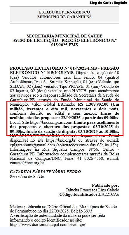 O processo licitatório será conduzido de forma eletrônica, com acolhimento das propostas iniciado nesta segunda-feira, dia 22. O prazo final para envio das propostas e a abertura oficial estão marcados para o dia 3 de outubro. O aviso de licitação está publicado no Diário Oficial de hoje, dia 22. (@blogcarloseugenio)