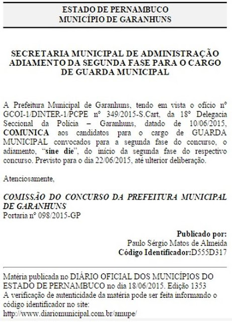de Garanhuns, através da Secretaria de Administração/Comissão do Concurso Público, informou que a segunda