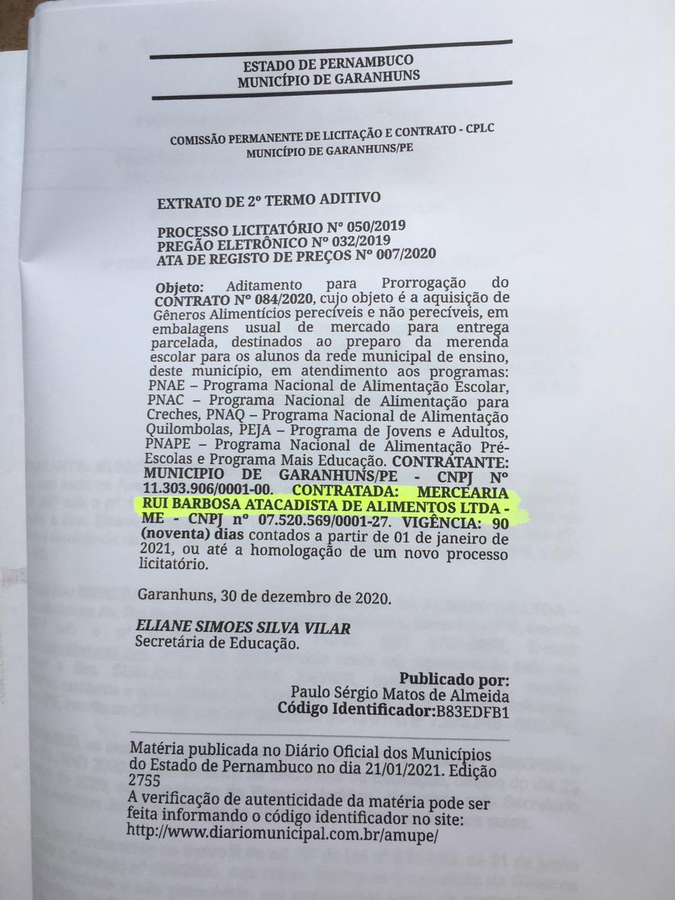 084/2020 (processo licitatório nº 050/2019), assinado pela então secretária de Educação,