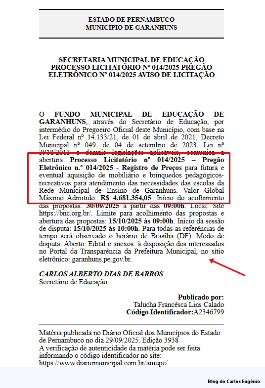 O Fundo Municipal de Educação de Garanhuns lançou o Processo Licitatório nº 014/2025, na modalidade Pregão Eletrônico, visando o registro de preços para futura e eventual aquisição de mobiliário e brinquedos pedagógicos-recreativos destinados às escolas da Rede Municipal de Ensino. O valor global máximo admitido é de R$ 4.681.354,05.