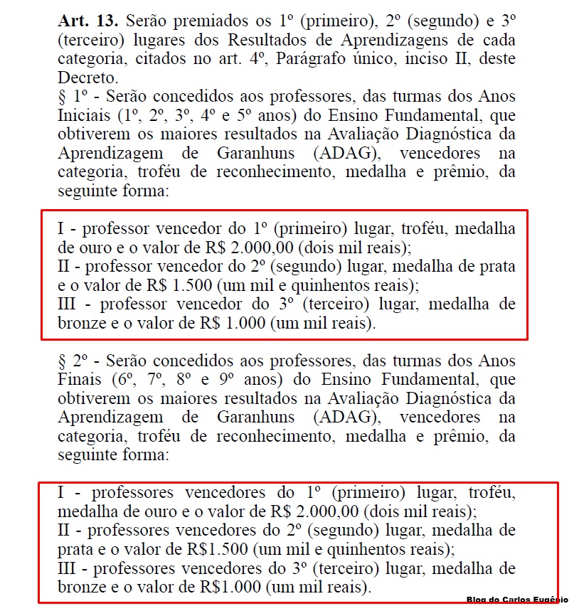 Dividido em duas categorias: Projetos Inovadores, que reconhecerão práticas pedagógicas de destaque, e Resultados de Aprendizagem, voltadas para professores e escolas com melhor desempenho na Avaliação Diagnóstica da Aprendizagem de Garanhuns (ADAG), a iniciativa vai gerar premiações variam entre R$ 1.000 e R$ 2.000 para os profissionais que alcançarem do terceiro ao primeiro lugar, além de troféus e medalhas. O Blog do Carlos Eugênio não conseguiu identificar a fonte dos recursos que serão utilizados para custear as premiações.