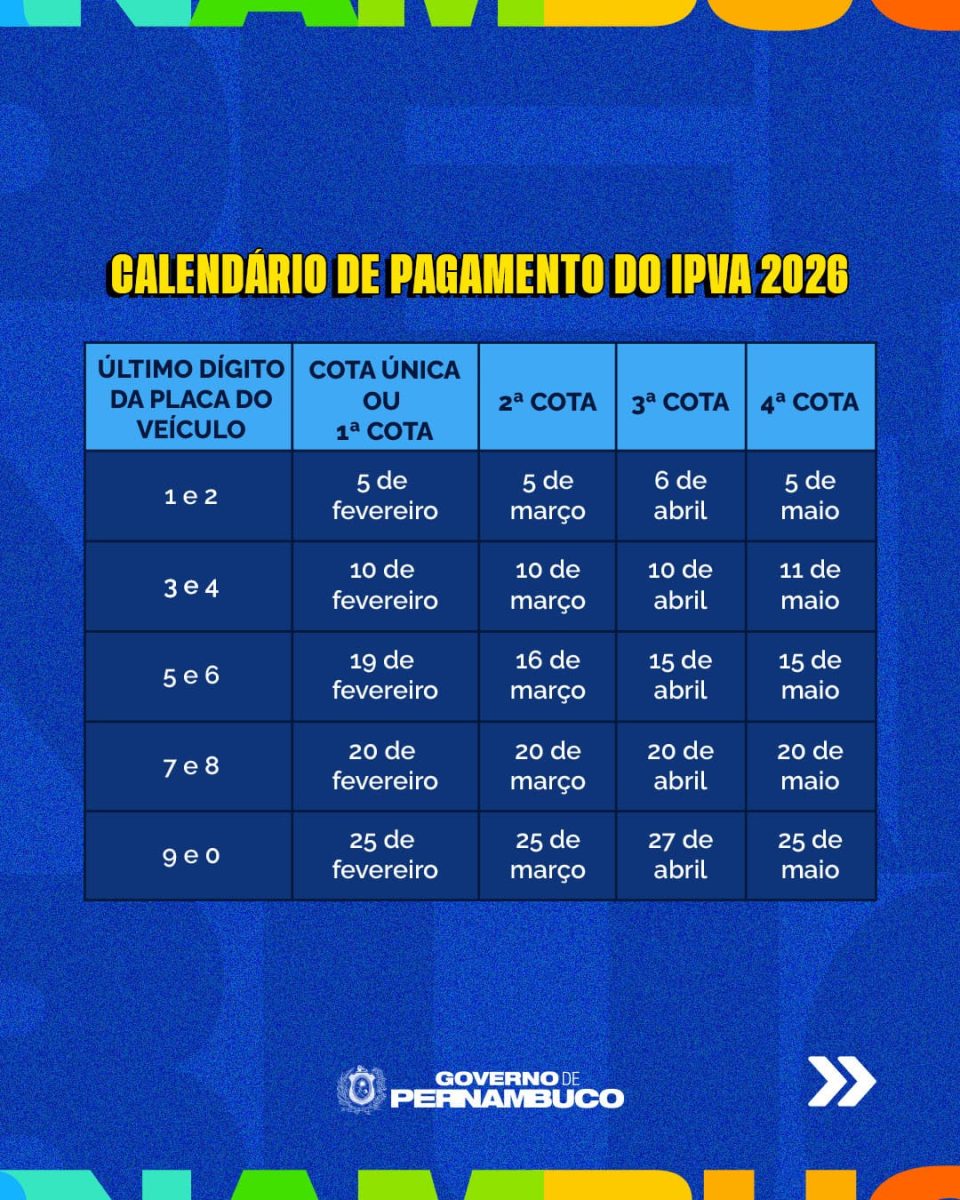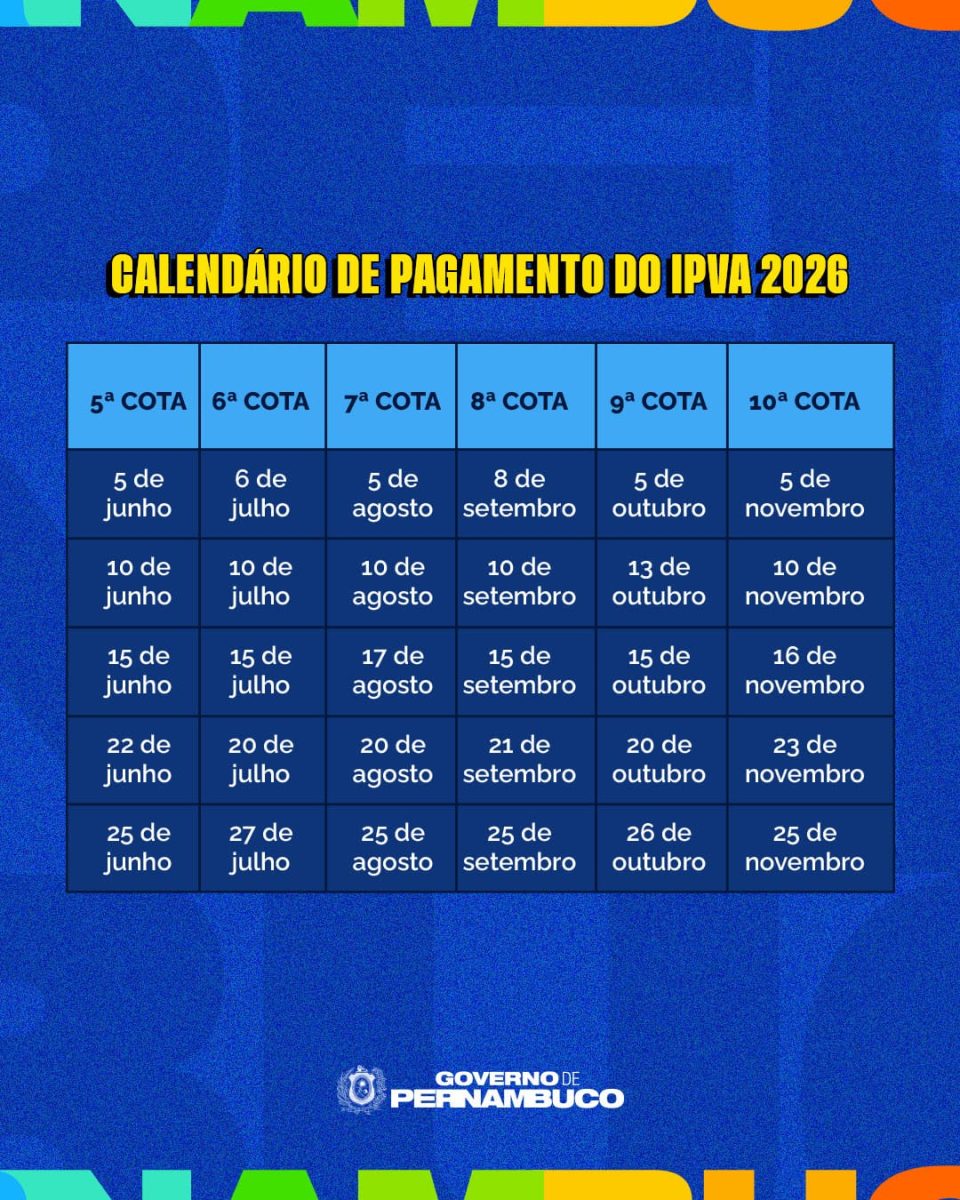 O Governo de Pernambuco, por meio da Secretaria da Fazenda de Pernambuco, divulgou o calendário de pagamento do Imposto sobre a Propriedade de Veículos Automotores (IPVA) para o exercício de 2026.