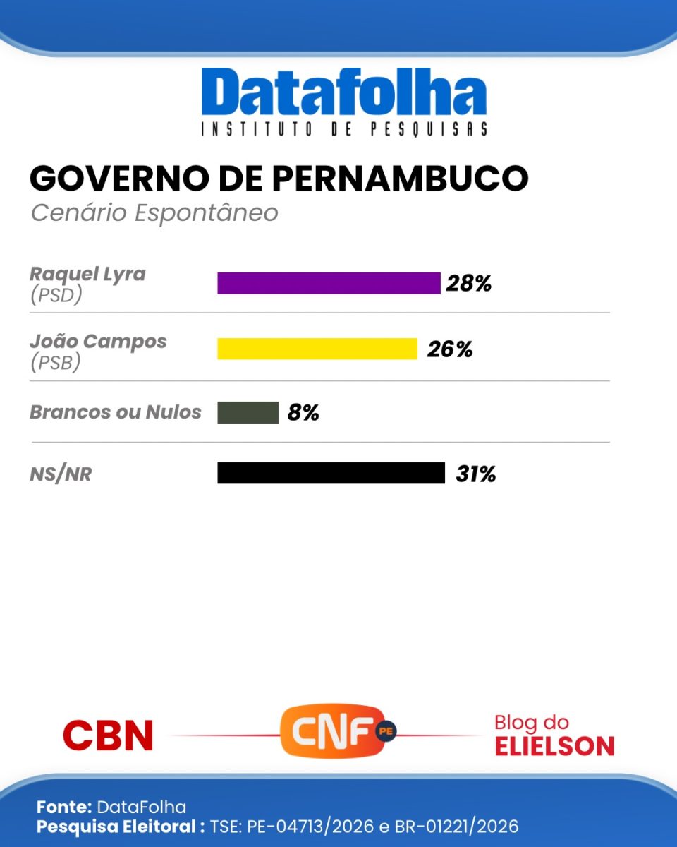 No cenário espontâneo, quando o entrevistado cita em quem pretende votar sem a apresentação de nomes, João Campos e Raquel Lyra aparecem, de acordo com Datafolha, empatados dentro da margem de erro, com vantagem numérica para a Governadora: 28% a 26%. (@blogcarloseugenio)