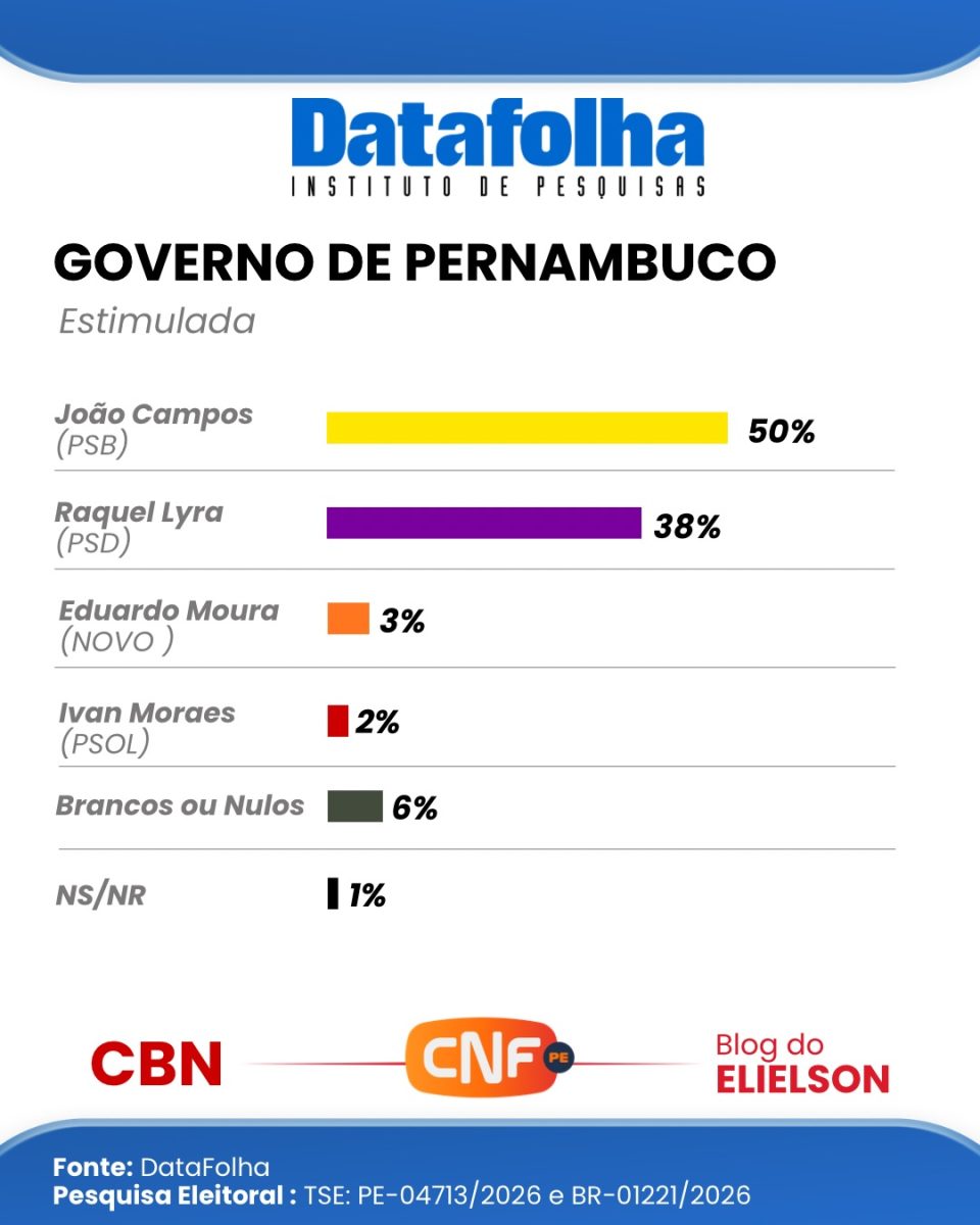 No cenário estimulado, o estudo mostra o Ex-prefeito do Recife, João Campos (PSB), na liderança com 50% das intenções de voto. A governadora Raquel Lyra (PSB), segundo o Datafolha, apareceu em segundo lugar, com 38%.