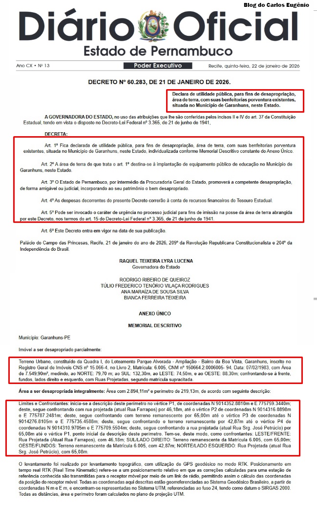 O Decreto foi assinado pela governadora Raquel Lyra e autoriza a desapropriação, de forma amigável ou judicial, de parte de um terreno urbano localizado no Loteamento Parque Alvorada – Ampliação, no bairro da Boa Vista. A área total do imóvel é de 7.549,90 m², sendo 2.894,11 m² destinados integralmente à implantação do equipamento público de educação.