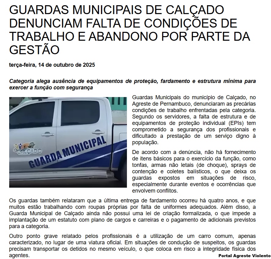 O Portal Agreste Violento trouxe a informação de que Guardas Municipais do município de Calçado, vem denunciando, segundo Eles, “as precárias condições de trabalho enfrentadas pela Categoria”.