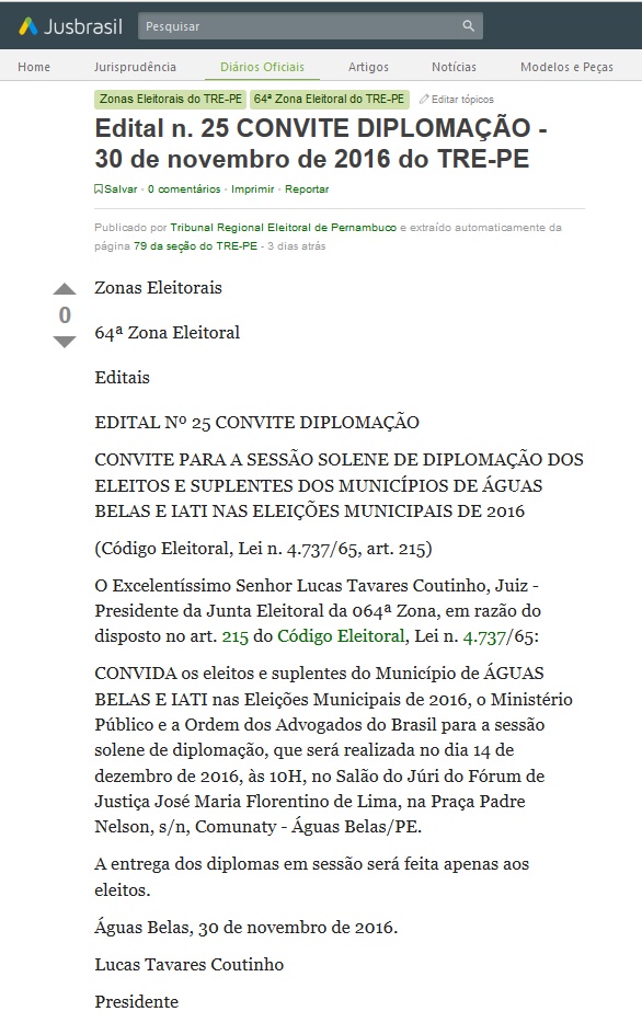 que preside a 64ª Zona Eleitoral, lançou o Edital de Convite para diplomação
