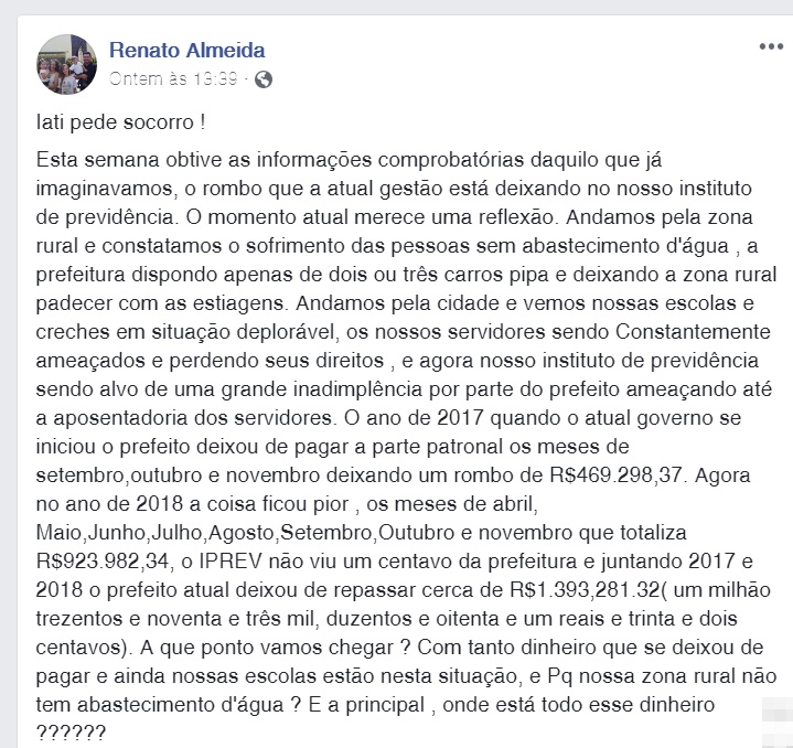 dois centavos)”, publicou o Vereador Renato Almeida em postagem no facebook. O Parlamentou não citou se levará a denúncia aos Órgãos de Fiscalização.