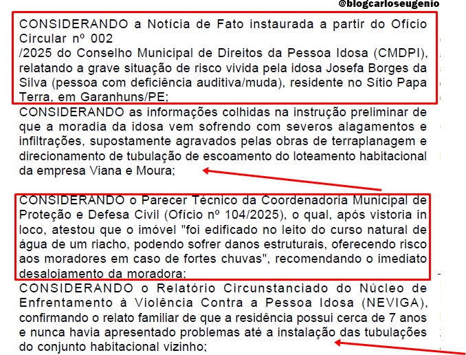 O procedimento registra que um parecer técnico da Defesa Civil Municipal apontou que o imóvel foi construído no leito natural de um Riacho, o que eleva o risco de danos estruturais e de acidentes em períodos chuvosos. O Órgão recomendou o desalojamento imediato da Idosa como medida preventiva.