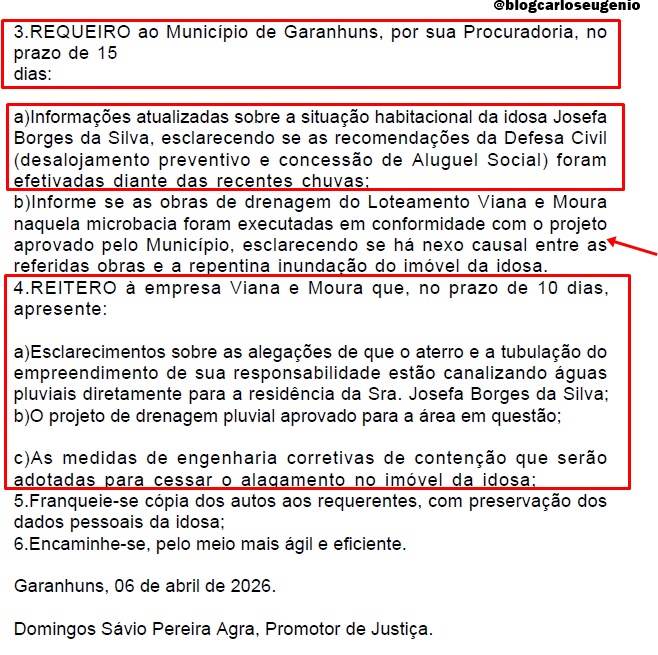 Em busca de solução para o problema, o Promotor Domingos Sávio determinou que a Prefeitura de Garanhuns informe, em até 15 dias, se adotou medidas como o desalojamento da Idosa e a concessão de aluguel social, além de esclarecer se as obras de drenagem foram executadas conforme o projeto aprovado pela Municipalidade.