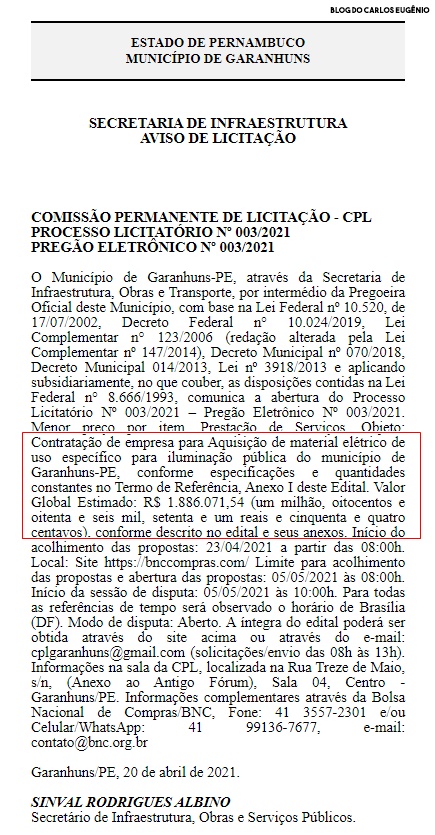 O Município de Garanhuns-PE, através da Secretaria de Infraestrutura,