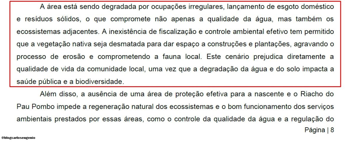Entre os principais problemas apontados estão ocupações irregulares, descarte de lixo e entulho, lançamento de esgoto e desmatamento em áreas que deveriam ser protegidas. A situação afeta diretamente a nascente do Riacho Pau Pombo, importante afluente do Rio Mundaú, e compromete a biodiversidade local .