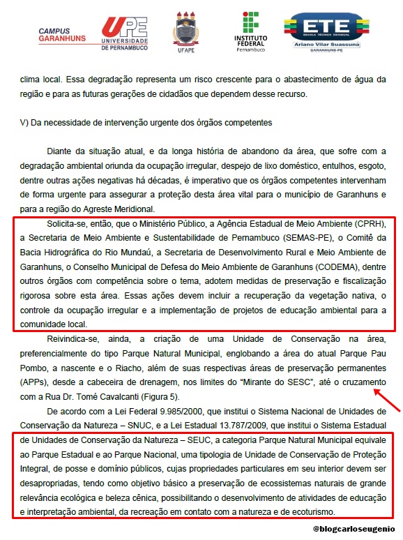 A carta solicita ainda a atuação urgente do Ministério Público de Pernambuco, de Órgãos Ambientais e da Prefeitura de Garanhuns para fiscalização, recuperação da vegetação nativa e controle das irregularidades. Clique AQUI para baixar a Carta na Íntegra. (@blogcarloseugenio)