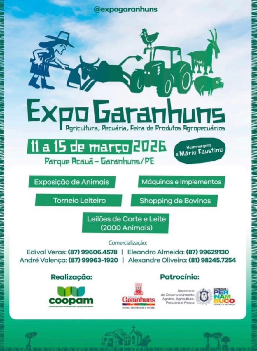 EXPOGARANHUNS – A ExpoGaranhuns será realizada pela Cooperativa de Produtores do Agreste Meridional (COOPAM), com patrocínio da Prefeitura de Garanhuns e do Governo do Estado de Pernambuco.