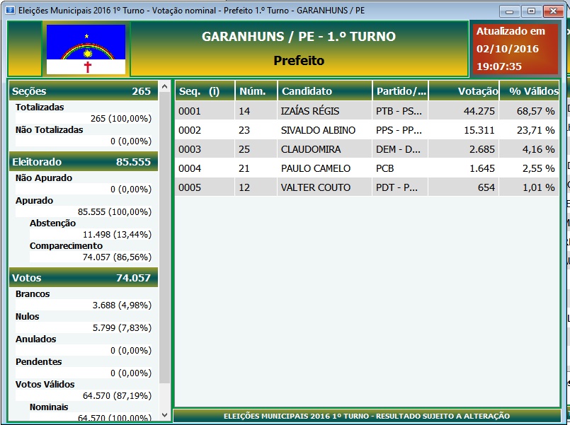 Régis (PTB) foi reeleito Prefeito de Garanhuns. Ele obteve 44.275 votos e vai