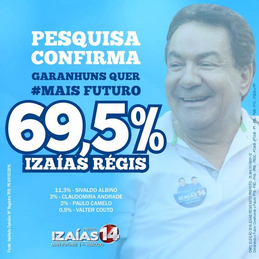 pelo Blog do Magno, Izaías Régis (PTB), estaria reeleito com 69,5% das