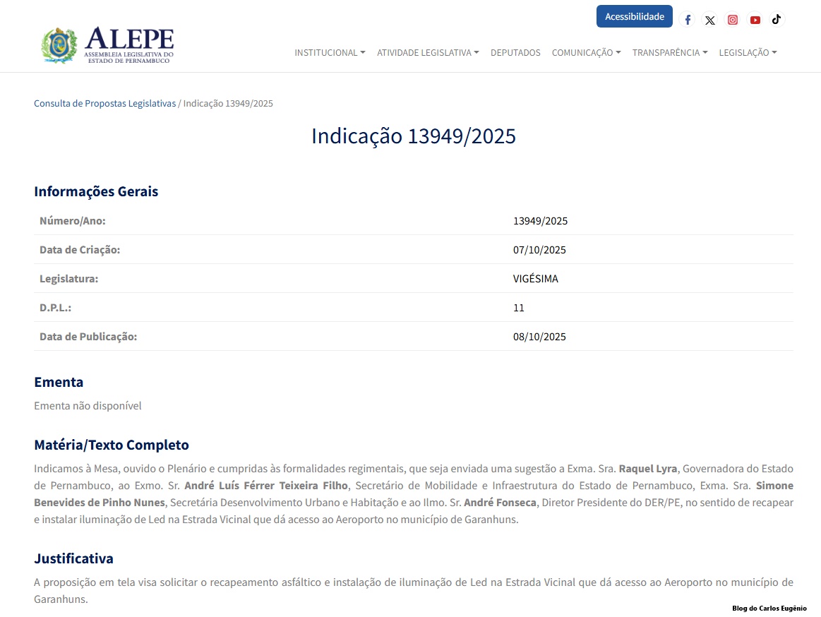 O deputado Estadual Izaías Régis (PSDB) apresentou, na Assembleia Legislativa de Pernambuco, a Indicação nº 13949/2025, solicitando ao Governo do Estado o recapeamento asfáltico e a instalação de iluminação em LED no acesso ao Aeroporto de Garanhuns.