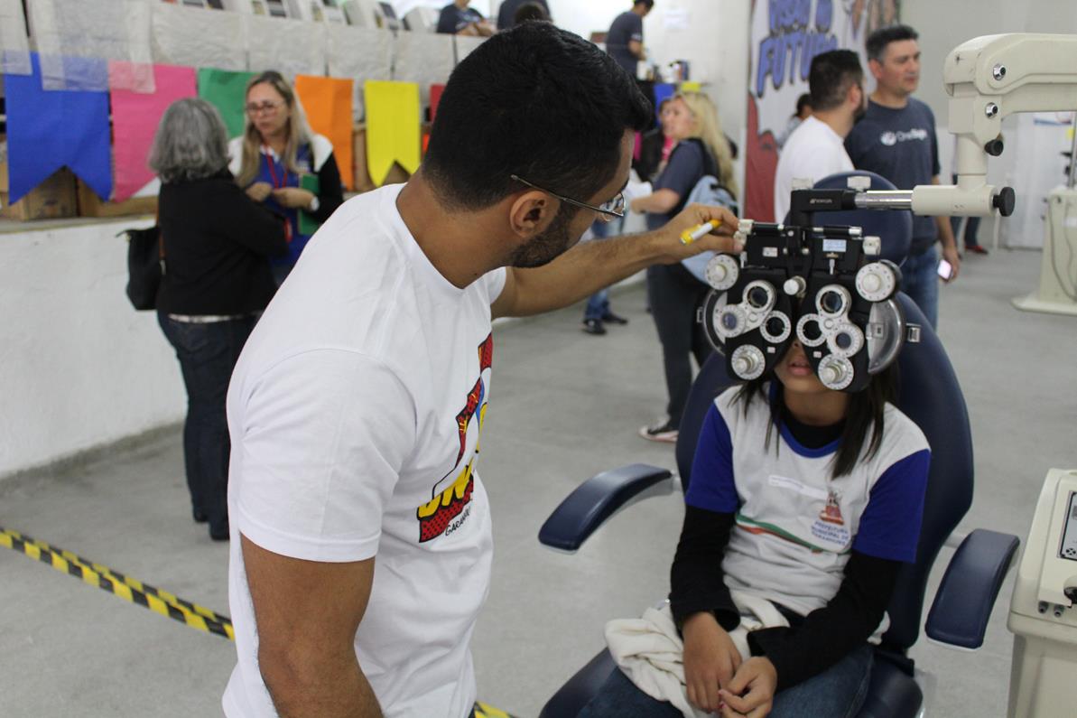 da Secretaria de Saúde, realizam o teste de acuidade visual, que tem como