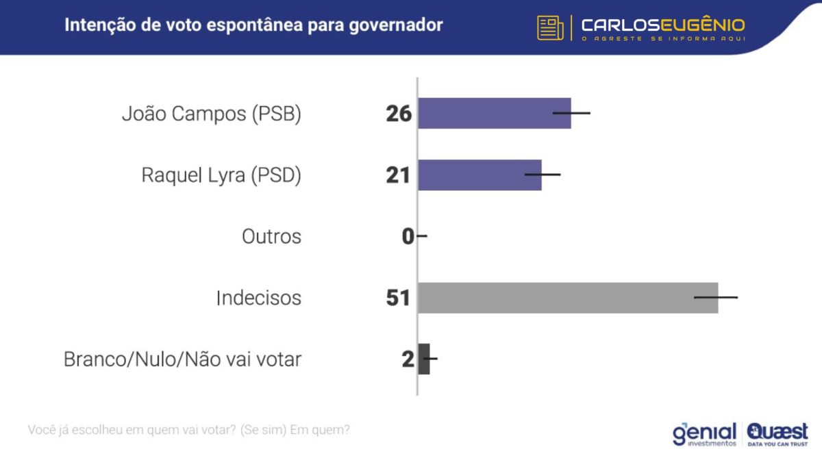 No cenário espontâneo, em que o entrevistado não conta com a citação dos nomes dos pré-candidatos, João Campos aparece com 26% das intenções de voto. Em seguida está a atual governadora, Raquel Lyra (PSD), com 21%. 51% se declararam indecisos, enquanto 2% afirmaram que pretendem votar em branco, nulo ou não comparecer às urnas.
