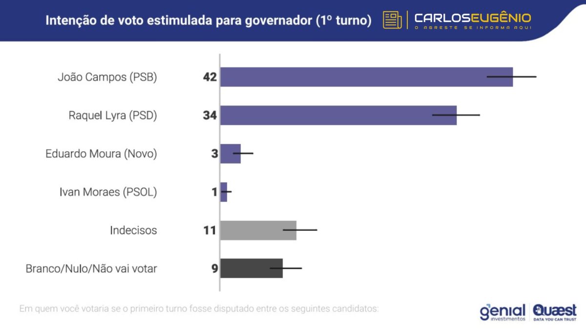 No cenário estimulado de primeiro turno, João Campos aparece com 42% das intenções de voto. Em seguida está a atual governadora, Raquel Lyra (PSD), com 34%. Os demais candidatos citados na pesquisa são Eduardo Moura, com 3%, e Ivan Moraes, com 1%. Entre os entrevistados, 11% se declararam indecisos, enquanto 9% afirmaram que pretendem votar em branco, nulo ou não comparecer às urnas.