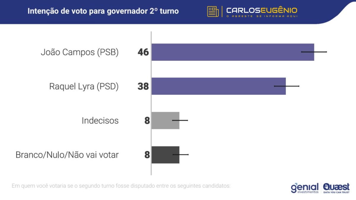 Já em um eventual segundo turno entre João Campos e Raquel Lyra, o Ex-prefeito mantém a dianteira, com 46%, contra 38% da Governadora. Nesse cenário, 8% dos eleitores estão indecisos e outros 8% indicam voto branco, nulo ou abstenção.