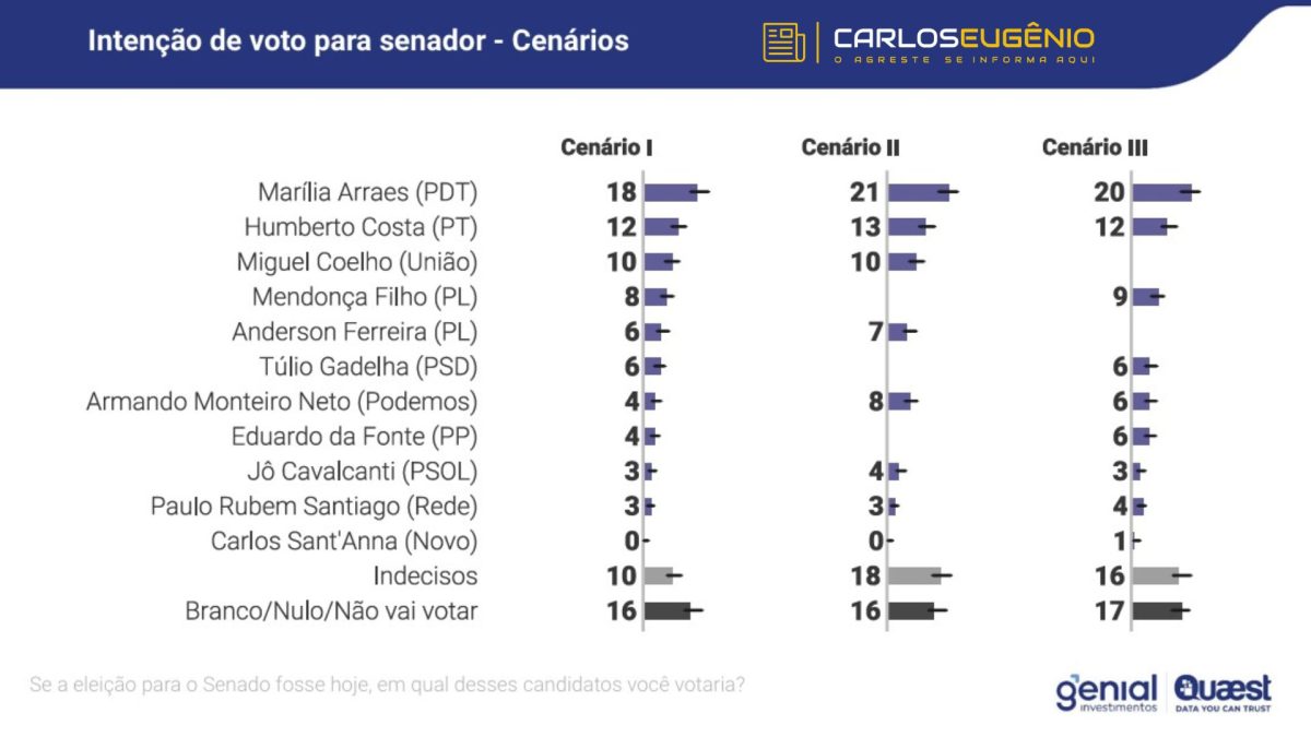 SENADO – No mesmo levantamento, a Quaest também avaliou a disputa pelo Senado e apontou a liderança de Marília Arraes em todos os cenários testados. No principal deles, a candidata aparece com percentuais entre 18% e 21%, seguida por Humberto Costa e Miguel Coelho, em um cenário considerado ainda indefinido devido ao alto número de indecisos.