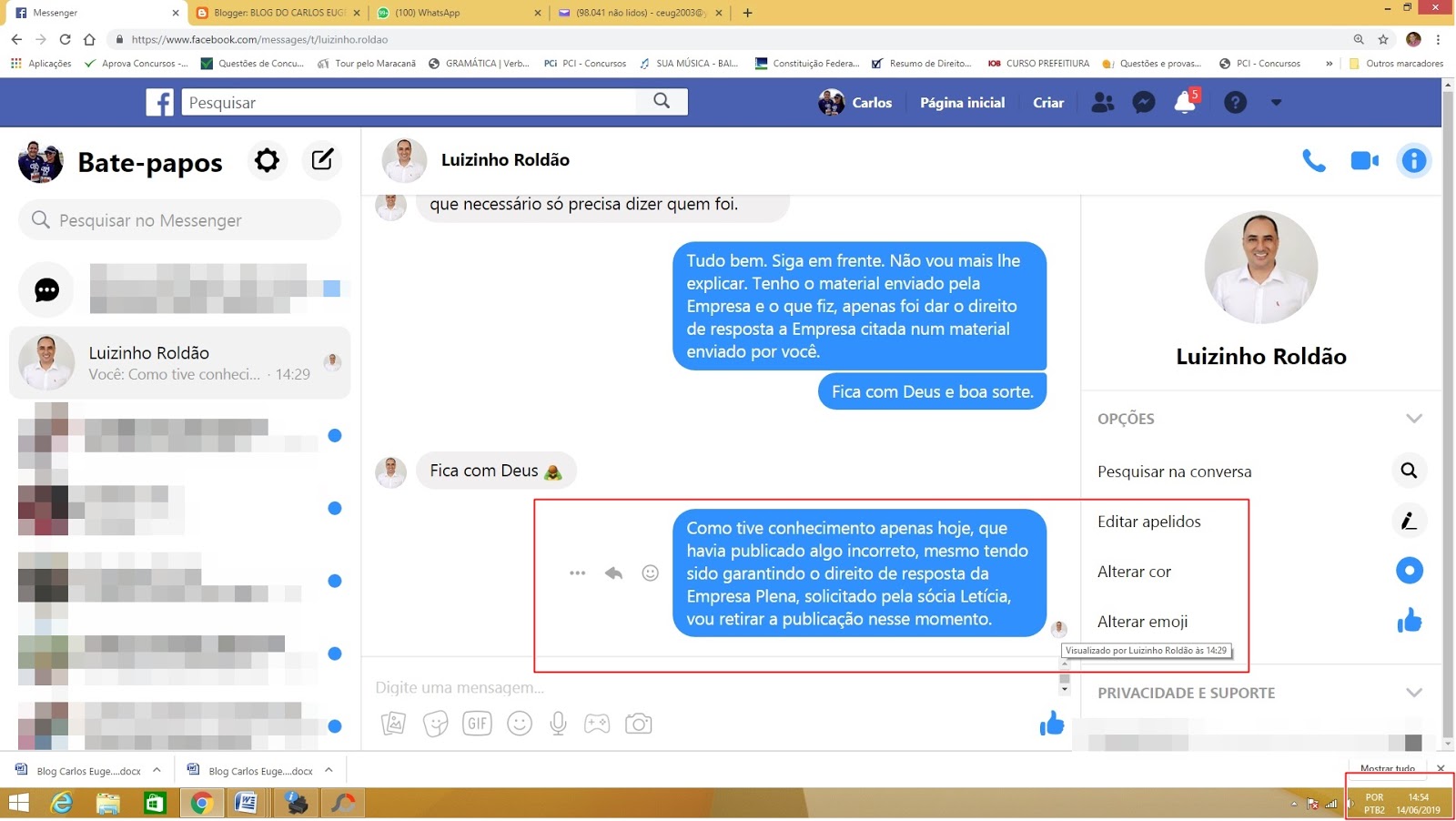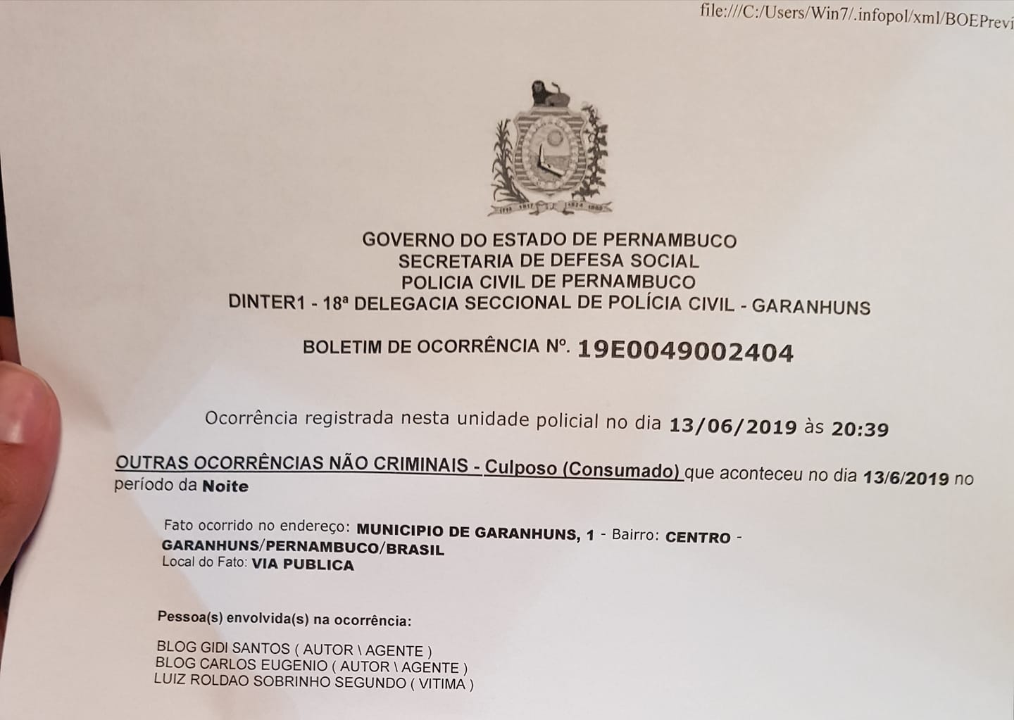 registrar o Boletim de Ocorrência nº 19E0049002404. Segundo Roldão, o Blog do Carlos