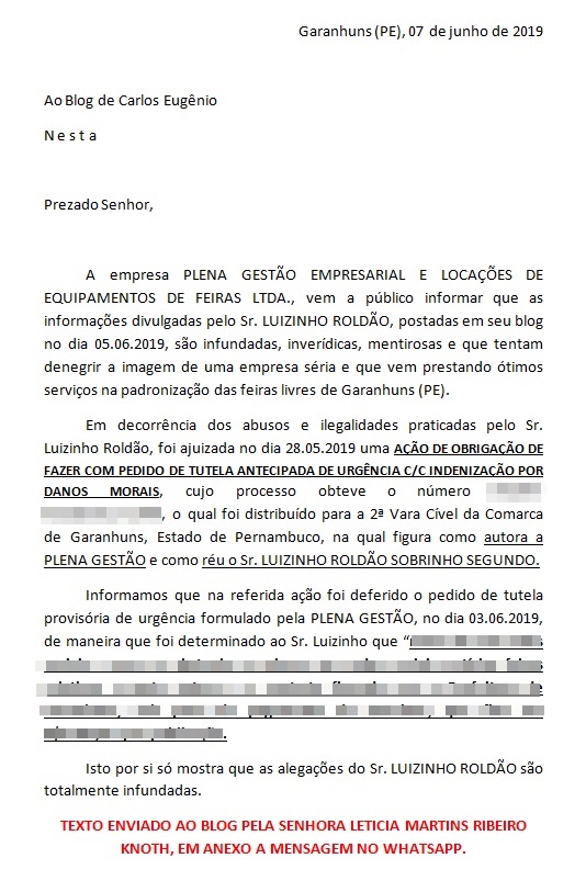 transcrição do Direito de Resposta da Plena foi publicada no dia 7 de junho,