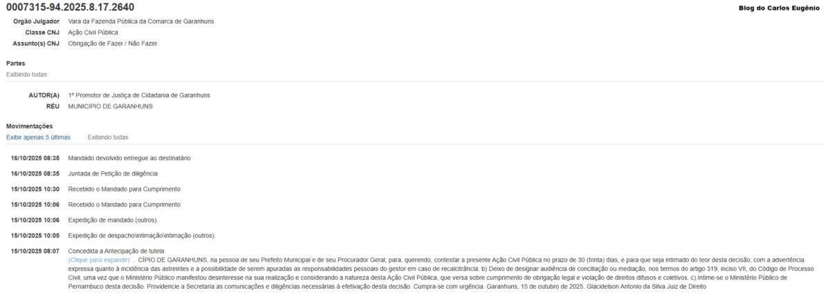 O Juiz Glacidelson Antonio da Silva, da Vara da Fazenda Pública da Comarca de Garanhuns, determinou liminarmente que a Prefeitura de Garanhuns apresente, no prazo de 30 dias úteis, o projeto executivo completo para a ampliação do Cemitério São Miguel, além das licenças ambientais e do cronograma físico-financeiro detalhado das obras.