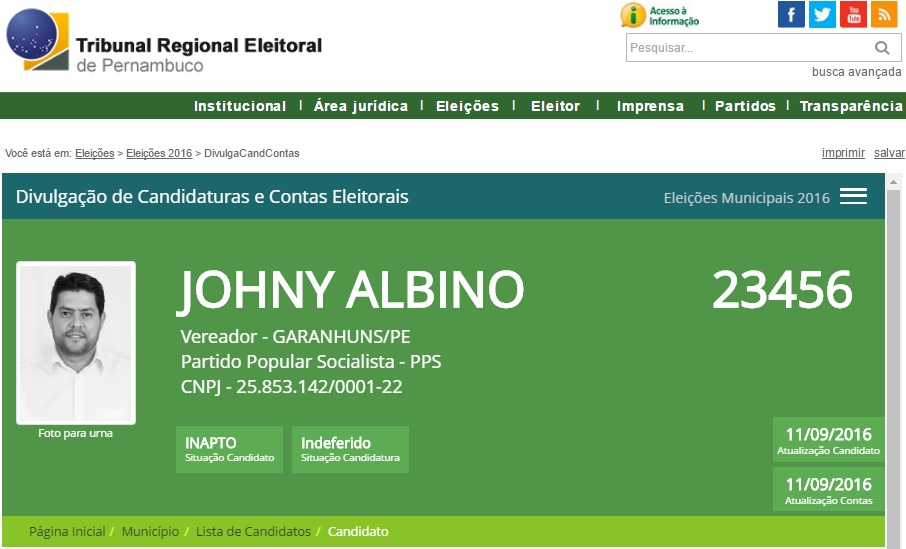 Eleitoral. Além de impugnar o registro de candidatura de Johny Albino