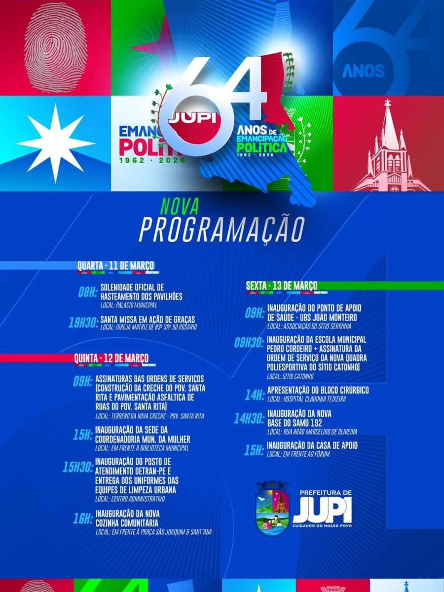 Diante desse cenário, os atos oficiais que integrariam a programação comemorativa foram reorganizados e acontecerão entre os dias 11 e 13 de março (de quarta a sexta), contemplando solenidades, assinaturas de ordens de serviço e inaugurações em diferentes áreas, como saúde, educação, assistência social e infraestrutura.