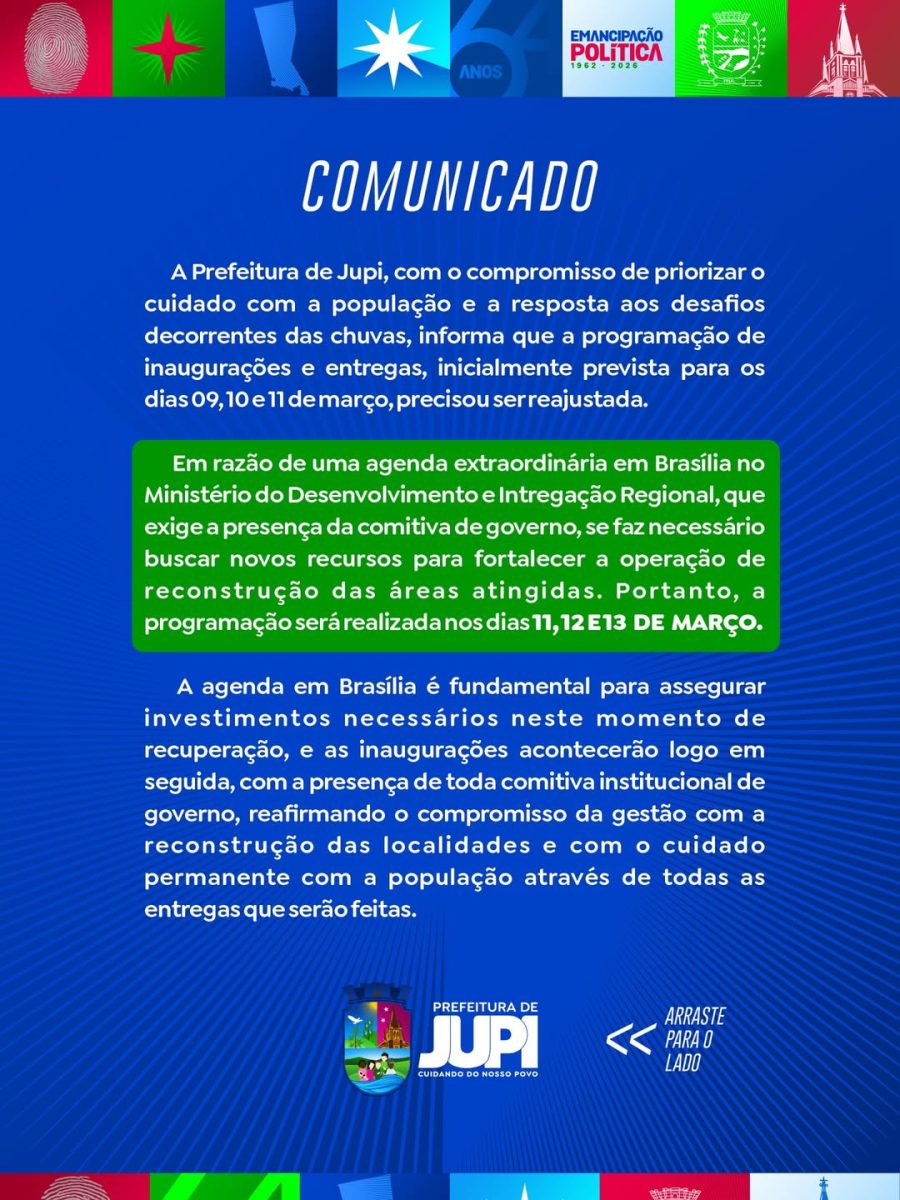 A Prefeitura de Jupi anunciou o Reajuste na programação de inaugurações e entregas previstas dentro das comemorações pelos 64 anos de Emancipação Política do Município. A mudança ocorreu devido a uma Agenda institucional Extraordinária da Prefeita Rivanda Freire, em Brasília, e também em razão das demandas geradas pelas recentes chuvas que atingiram o Município.