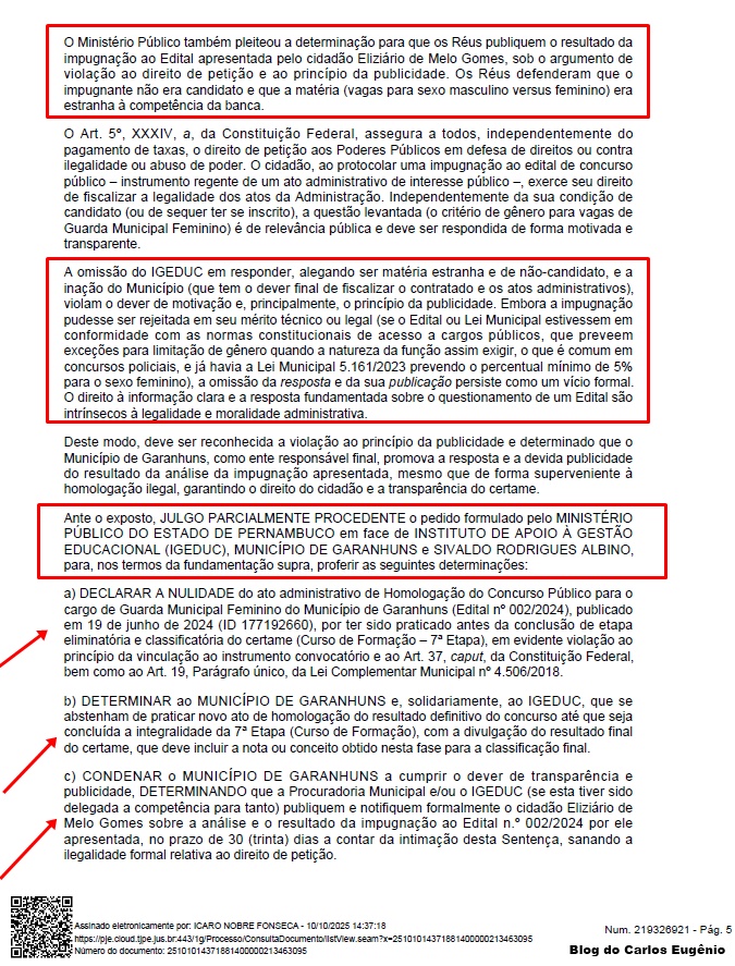O Juiz Ícaro Nobre Fonseca, da Central de Agilização Processual do Tribunal de Justiça de Pernambuco, anulou a homologação do concurso público da Guarda Municipal Feminina de Garanhuns, regido pelo Edital nº 002/2024.