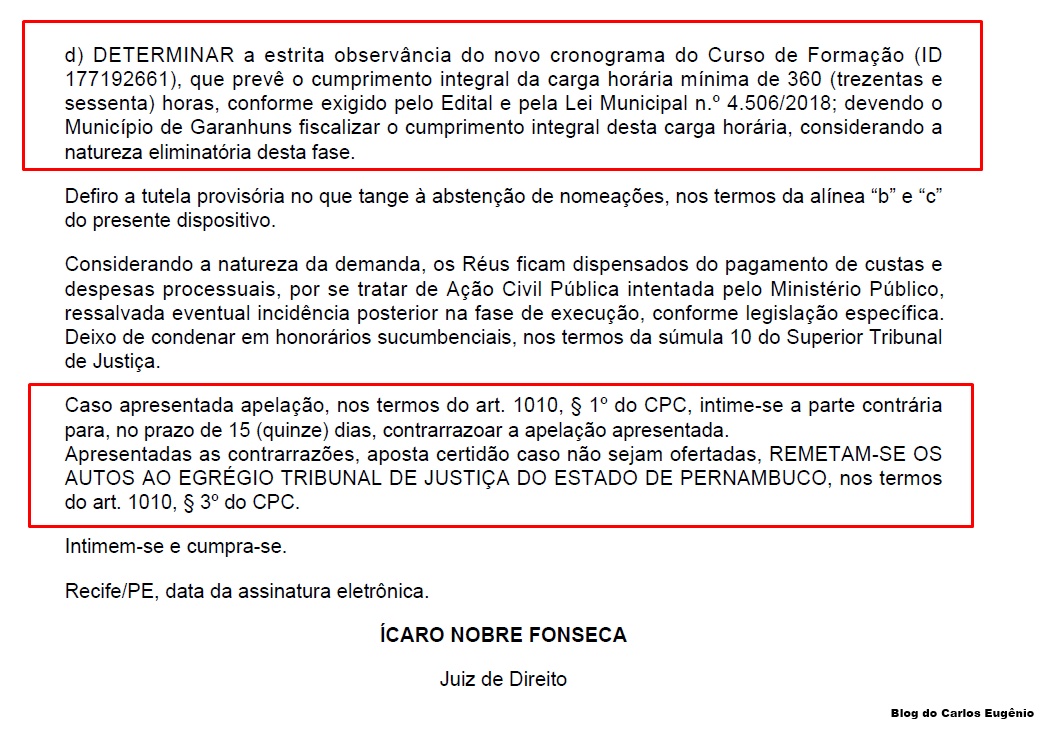 O Juiz também ordenou que a Prefeitura publique a resposta à impugnação apresentada por um Cidadão Garanhuense, assegurando o direito de petição e o princípio da publicidade. Além disso, determinou que o curso de formação cumpra integralmente as 360 horas-aula exigidas pela Lei Municipal nº 4.506/2018.