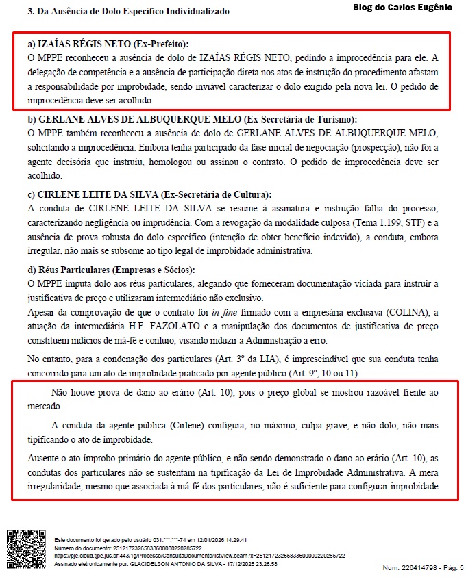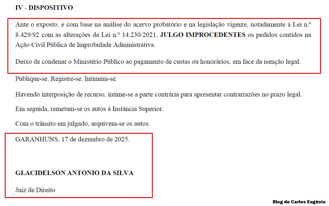 Na sentença, o Magistrado concluiu que não ficou comprovado dano efetivo ao erário, nem a existência de dolo específico por parte dos agentes públicos, sobretudo do Prefeito da época e atual deputado Estadual, Izaías Régis, e julgou improcedentes todos os pedidos da Ação. A sentença determinou o arquivamento do Processo após o trânsito em julgado, caso não haja interposição de recurso. Clique AQUI para baixar a Decisão Judicial. (@blogcarloseugenio)