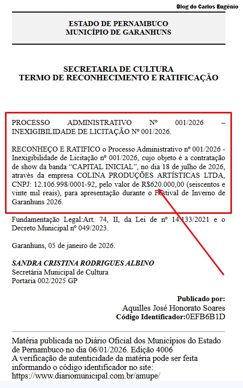 No último dia 6, o Diário Oficial trouxe a formalização do Contrato com a banda de rock Capital Inicial, que se apresentará no Palco Mestre Dominguinhos no dia 18 de julho. O show, contratado junto a Colina Produções Artísticas LTDA, vai custar R$ 620 mil reais, aos cofres públicos municipais.