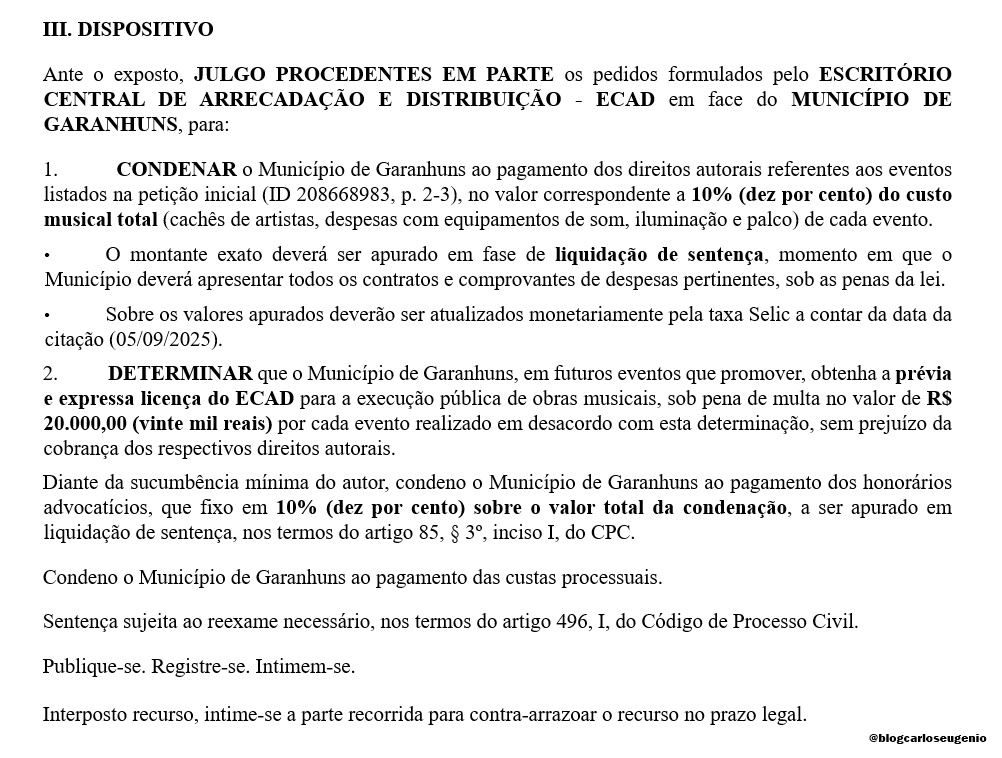 A Vara da Fazenda Pública da Comarca de Garanhuns condenou o Município ao pagamento de direitos autorais ao Escritório Central de Arrecadação e Distribuição (ECAD) pela realização de eventos musicais, entre os anos de 2022 e 2025, sem o devido recolhimento.