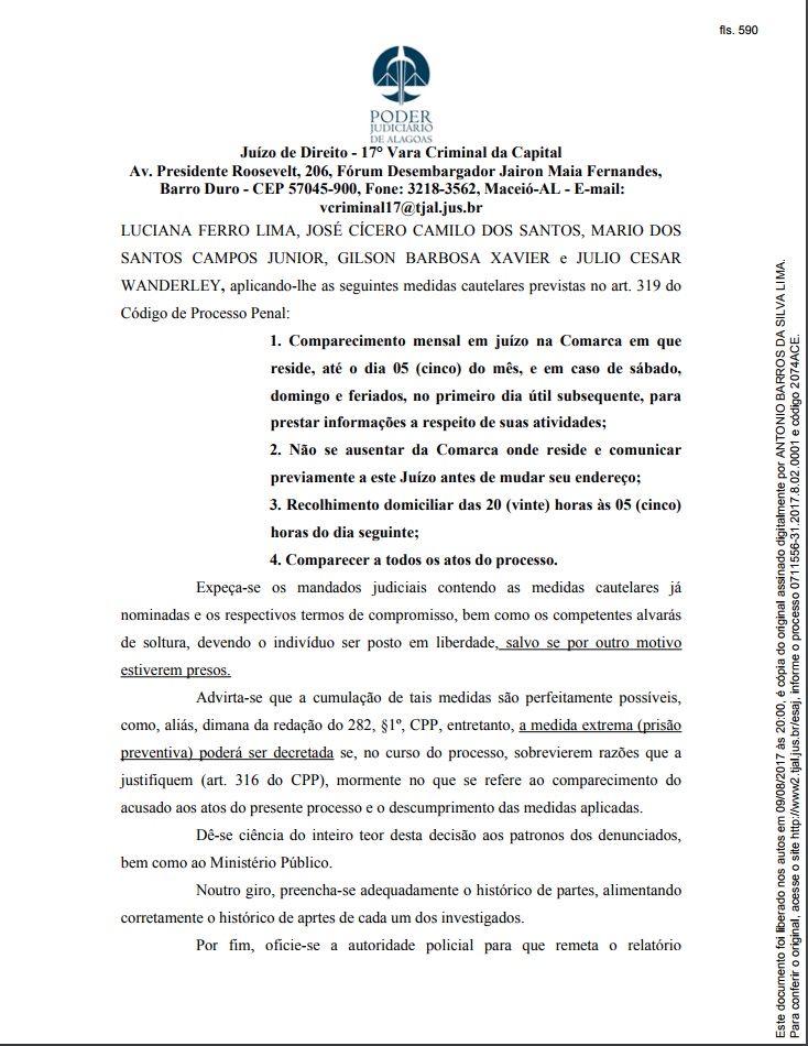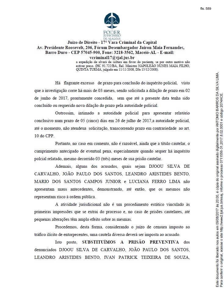 da 17ª Vara Criminal da Capital de Alagoas decidiram substituir a prisão preventiva dos acusados no Processo nº 0711556-31.2017.8.02.0001 para as