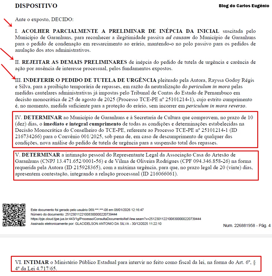Diante disto, o juiz Glacidelson Antonio da Silva, titular da Vara da Fazenda Pública de Garanhuns, proferiu decisão no último dia 30 de dezembro, sobre a Ação Popular nº 0006062-71.2025.8.17.2640, ajuizada por Rayssa Godoy, atual presidente do PSDB/Garanhuns, e que tem como réus a Prefeitura, a secretária de Cultura, Sandra Albino, a Associação Casa do Artesão de Garanhuns, e Vilma de Oliveira Rodrigues, dirigente da Associação.
