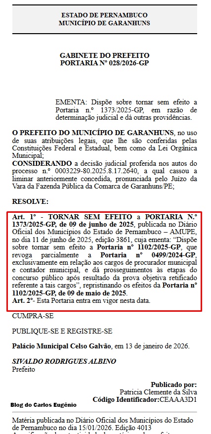 O caso teve origem após a edição da Portaria nº 1.102/2025-GP, pela Prefeitura de Garanhuns, que revogou parcialmente a homologação anterior do Concurso e promoveu a reclassificação de candidatos, em razão de inconsistências identificadas no gabarito da prova objetiva. Segundo a Administração Municipal, foram constatados erros materiais e questões baseadas em legislação não prevista no edital, situação reconhecida tecnicamente pelo Instituto de Apoio à Gestão Educacional (IGEDUC), organizadora do Certame, e pelo Ministério Público.