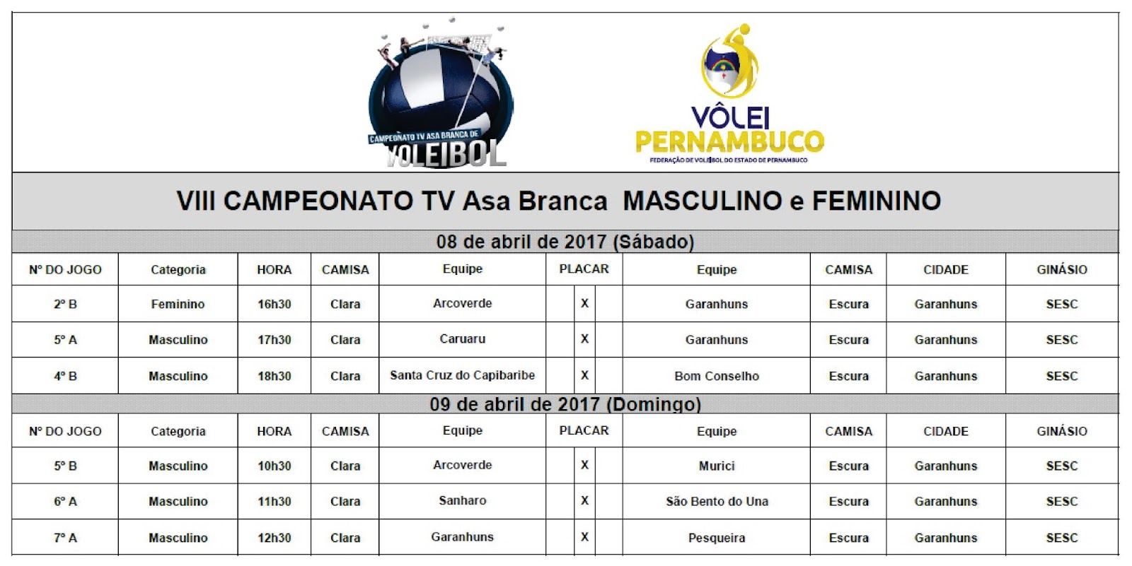 das 10h30min, tem mais voleibol na Quadra do SESC/Garanhuns. Arcoverde x Murici e Sanharó x São Bento do