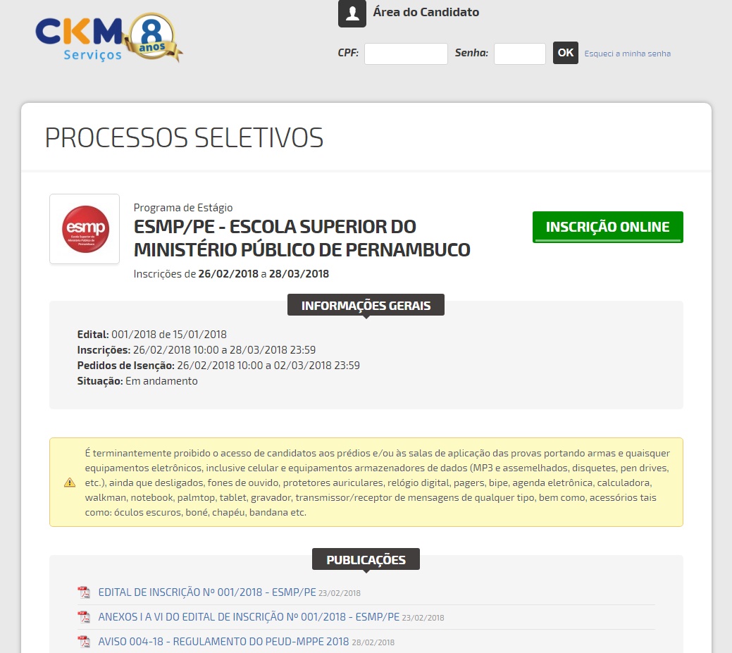realizadas somente pela internet, no link: https://ckmservicos.selecao.net.br/informacoes/26/.