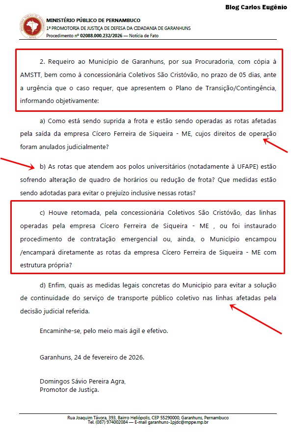 No despacho, a Promotoria destaca que já havia expedido, em dezembro passado, recomendação formal orientando o Município a adotar medidas emergenciais, como operação direta, contratação emergencial ou requisição de frota, para evitar prejuízos à população.